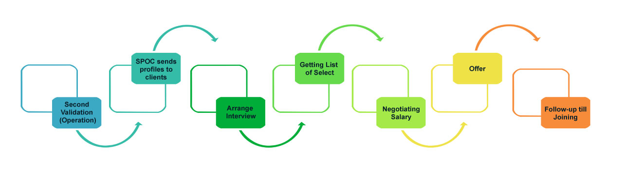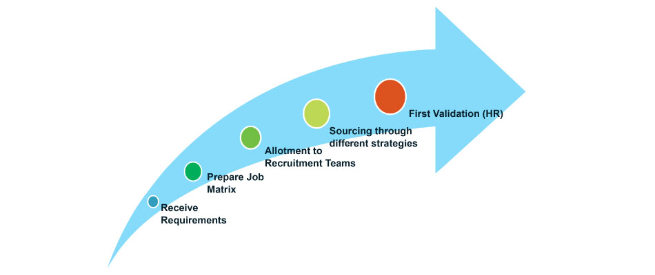As soon as the job description is received, the SPOC shares the same with the team who source through different strategies. The recruiters follow a checklist they strictly are required to adhere to and speak to the candidate. If the profile is found suitable, it is then passed to the Quality division. A thorough quality check is done and the same is forwarded to Team Leader who does a Functional Gauging of Candidate. Profiles that qualify are sent to the Team Manager who checks the candidate from a HR as well as Functional Stand point. Profiles that pass the double vetting interviews are sent to SPOC who send the same to the client.